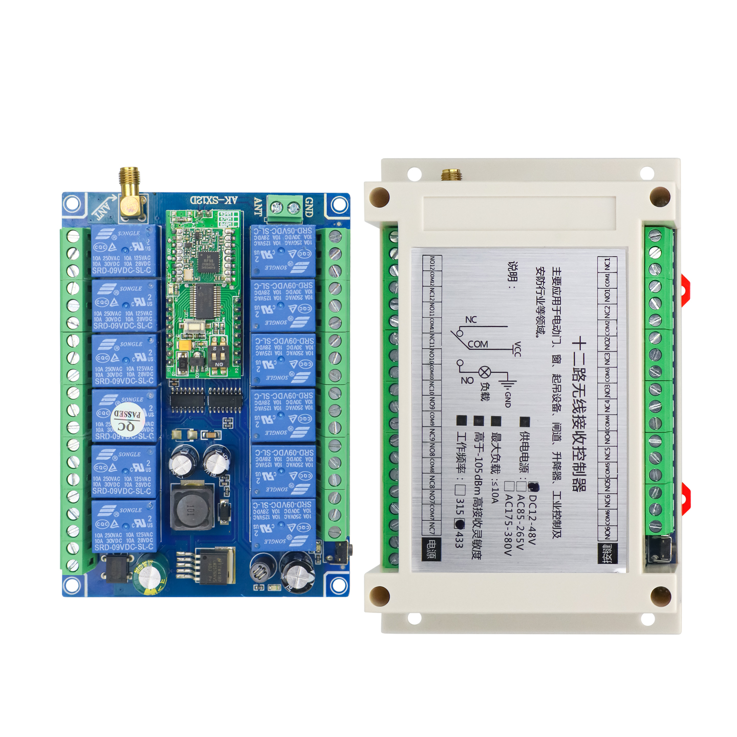 这是我公司最新设计研发生产的超远距离双向十二路控制器。采用LoRa扩频通讯技术,抗干扰性非常强,超高灵敏度;符合当今社会的主流应用,性价比高;使用方便,通过拨码开关可轻松设置输出为点动、自锁、互锁等功能。安全可靠,当你遥控丢失时,只需将接收控制器中存储的信息清除,所丢失的遥控就不能对你的控制器进行操作。