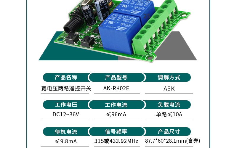 宽电压两路遥控开关 AK-RK02E