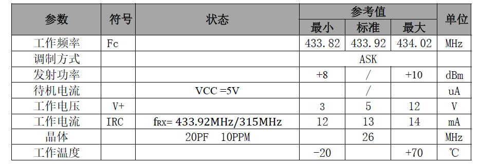 不带编码3-12V宽电压发射模块(AK-T241202)采用品牌发射芯片,调制方式为ASK调制。具有超低功耗,传输速率高等特点,并且在数据传输上具有超高稳定性。芯片的高度集成使其简化了系统设计所需的外围物料,体积更小,用户只需要外加简单的数据解码电路,即可轻易实现无线产品的开发,更大程度上提高的产品性能与加强了产品竞争力度。