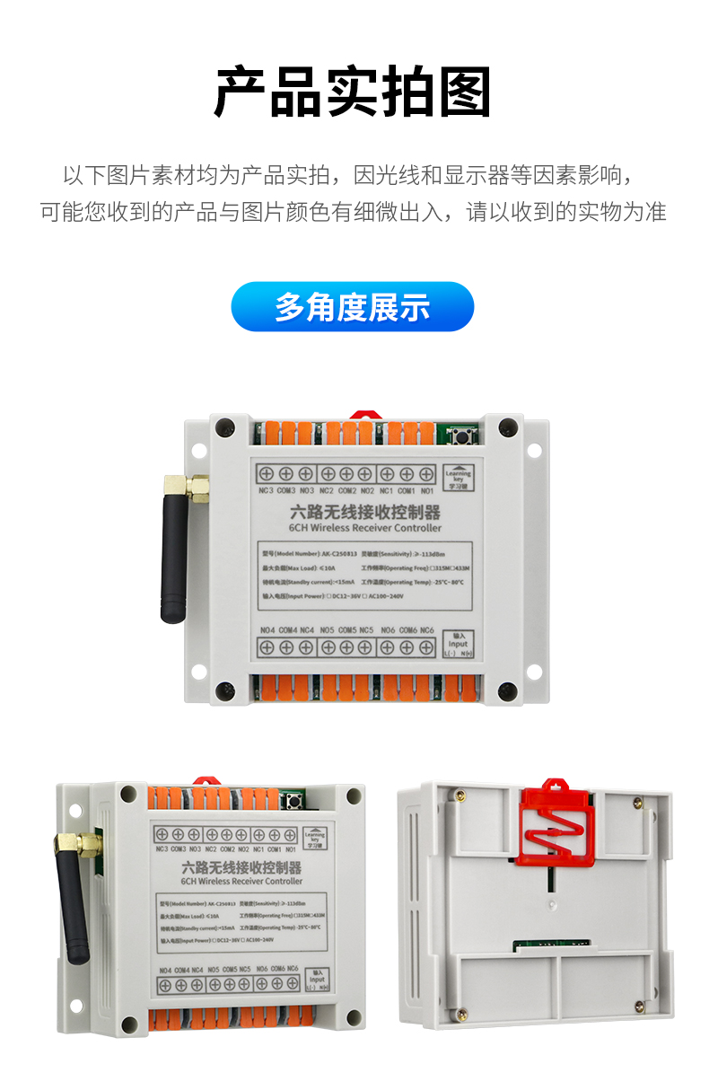 奥柯交流快接端子6路工业级遥控开关(AK-C250813)是采用ASK通信方式的控制器,拥有数据传输稳定性强和接收灵敏度高的特点。