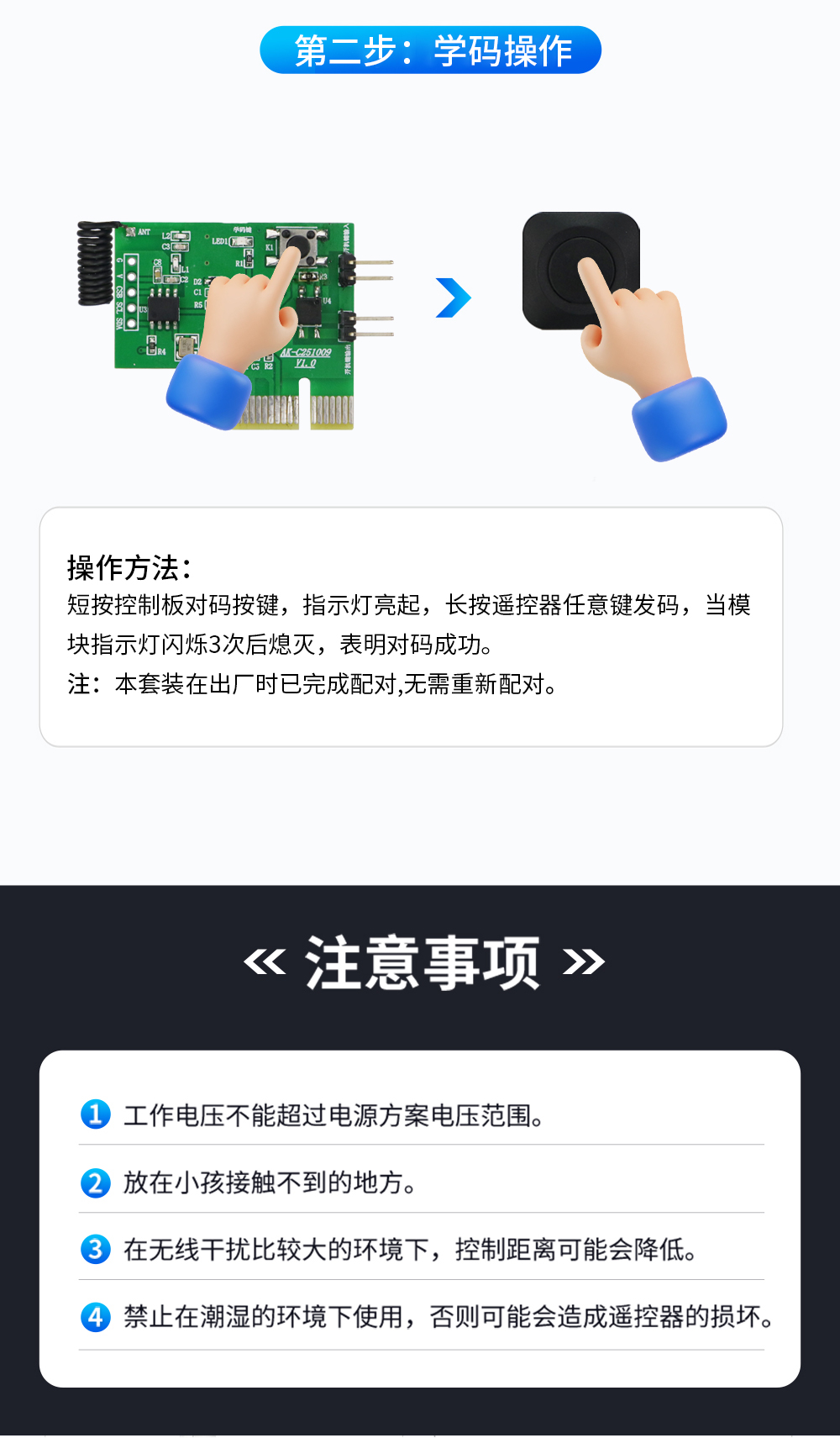 按一下控制板对码按键,指示灯亮起,长按遥控器按键发码,当模块的指示灯闪烁3次后熄灭,表示对码成功;