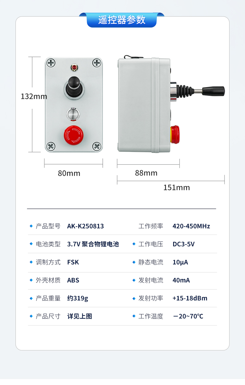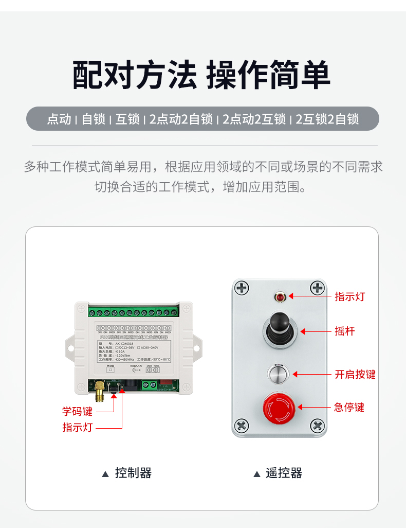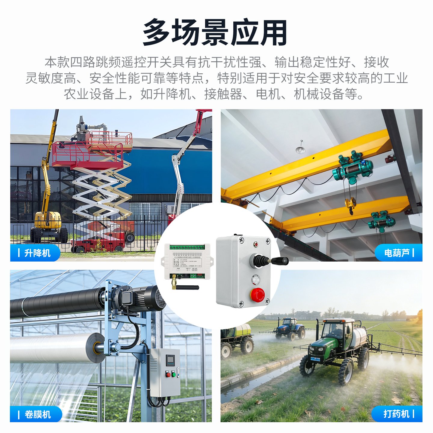 摇杆跳频FSK直流小工控四路控制开关 (AK-C240318)具有抗干扰性强、输出稳定性好、接收灵敏度高、传输速率快等特点,特别适用于对安全要求较高的工业设备上,如升降机、农业设备、直流电机、自动化设备等。