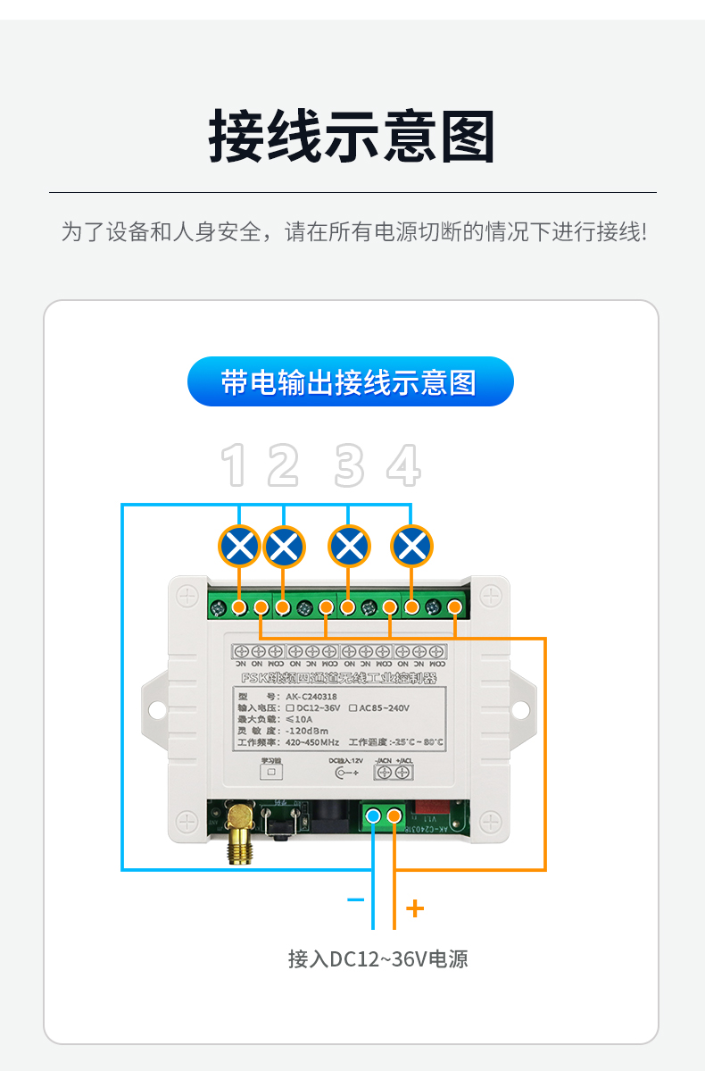 摇杆跳频FSK直流小工控四路控制开关常用接线操作: