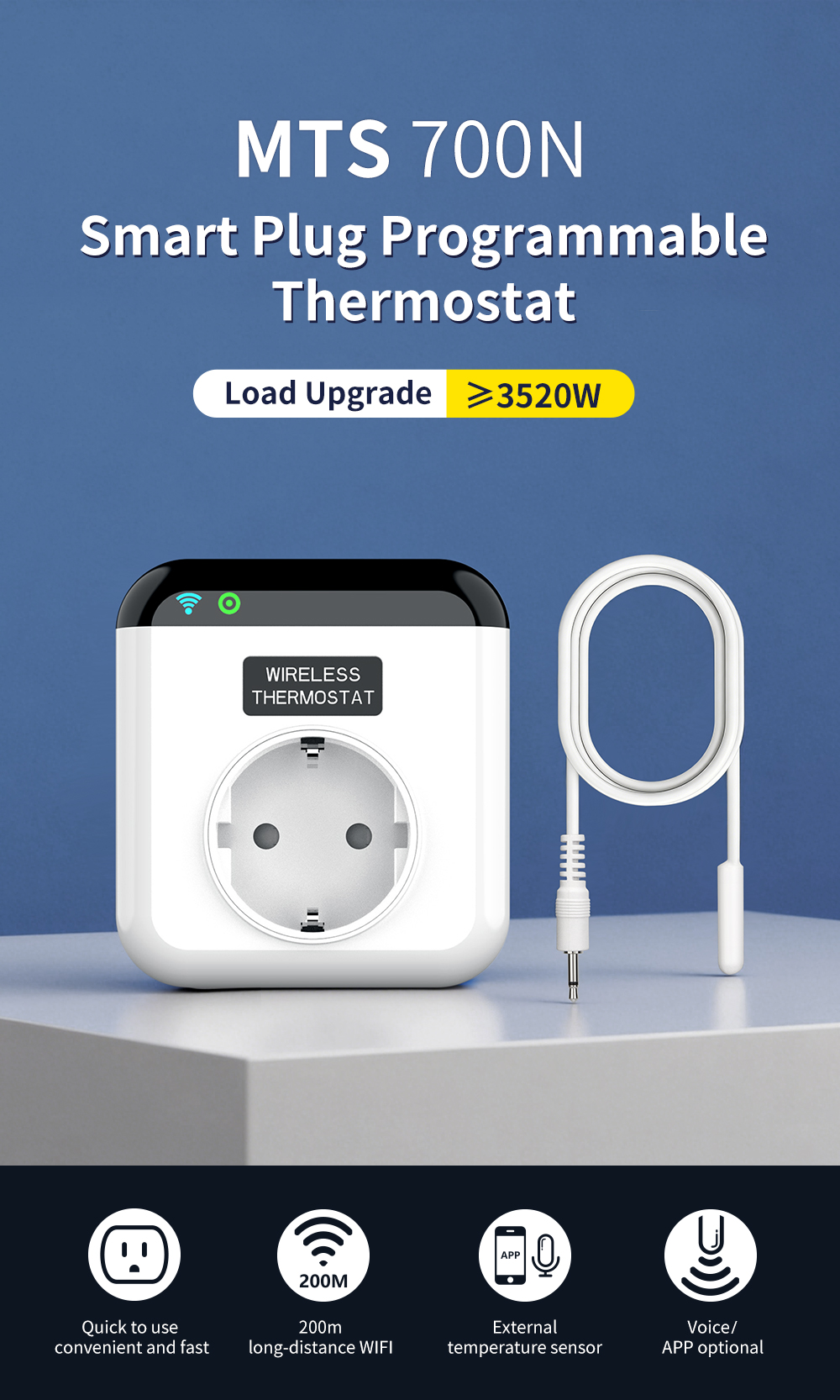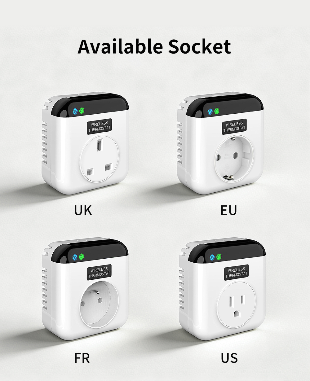 APP远程调温WiFi智能插座 MTS700,有欧规、美规、英规等多种规格可选,可做跨境货源;遥控器可设定温度数据,当温度低于设定值时,插座会自动开启通电,让设备自动开始工作调整温度;支持手机app远程调节温度,可实时监控温度,也可设计延时关闭模式、多段编程模式等,大大增加了使用便利性;
