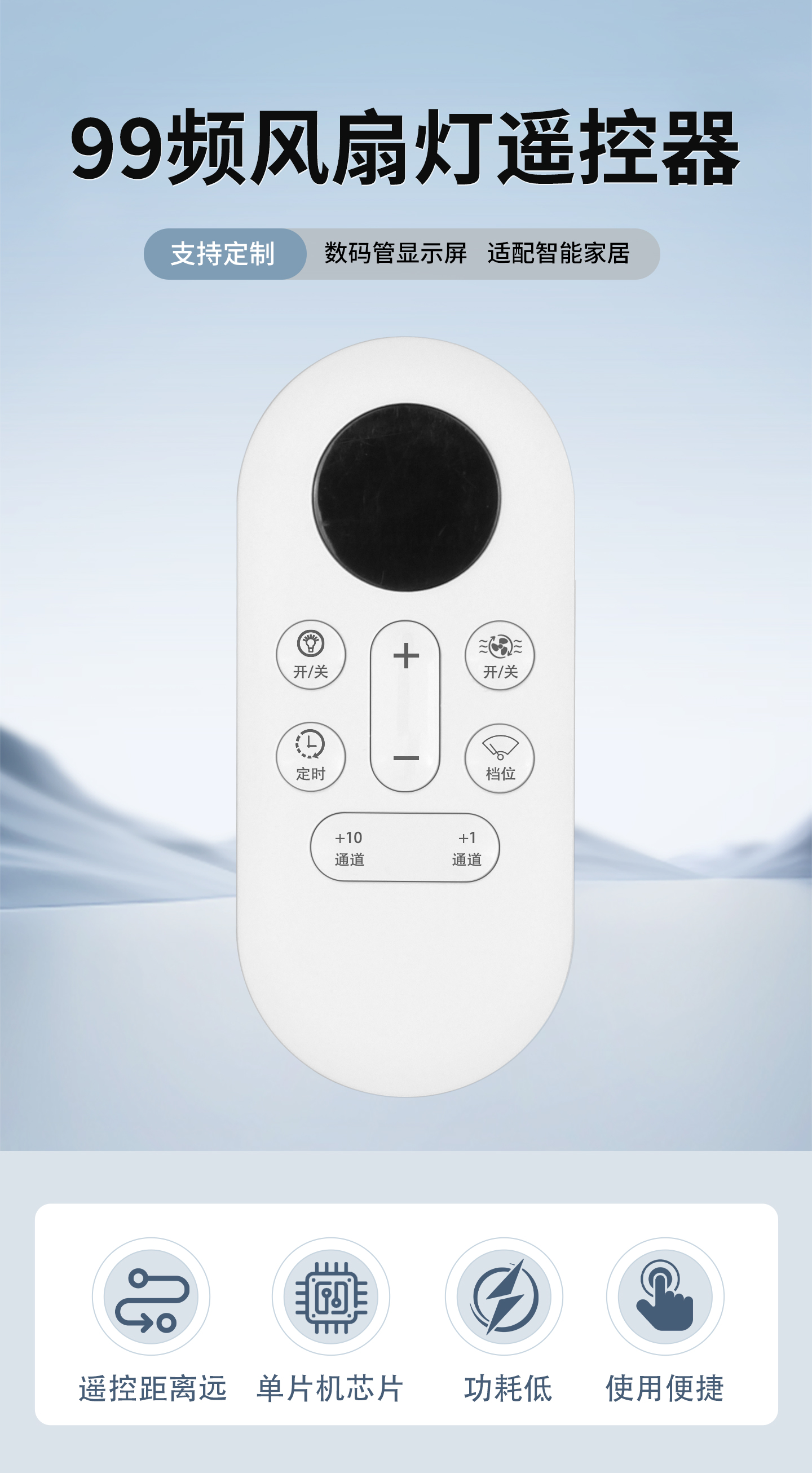 AK-K2500603 99频道跑道型数码管遥控器搭载单片机自主编程方案,采用标准 1527 编码格式,99 路独立可控通道。产品配备跑道型数码管实时显示通道状态,按键操作响应灵敏,可一键精准切换对应控制通道。整机采用低功耗设计,遥控距离稳定可靠,信号传输抗干扰性强,专为四路语音控制开关深度适配,可广泛应用于语音控制开关、智能家居及各类智能终端设备的无线控制场景,满足工业与民用多场景稳定操控需求。
