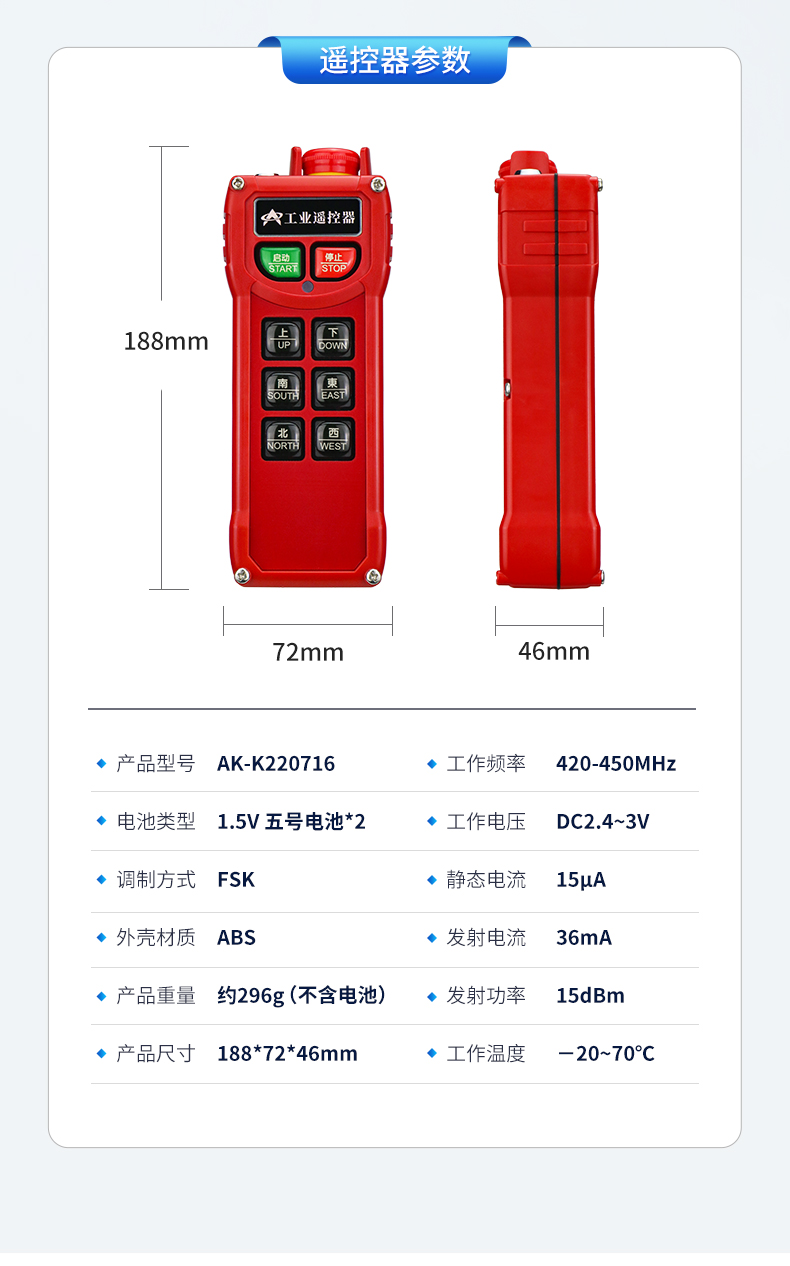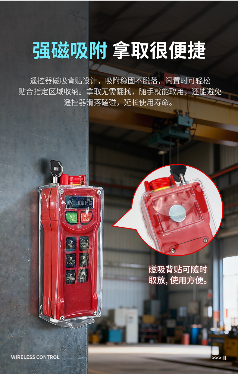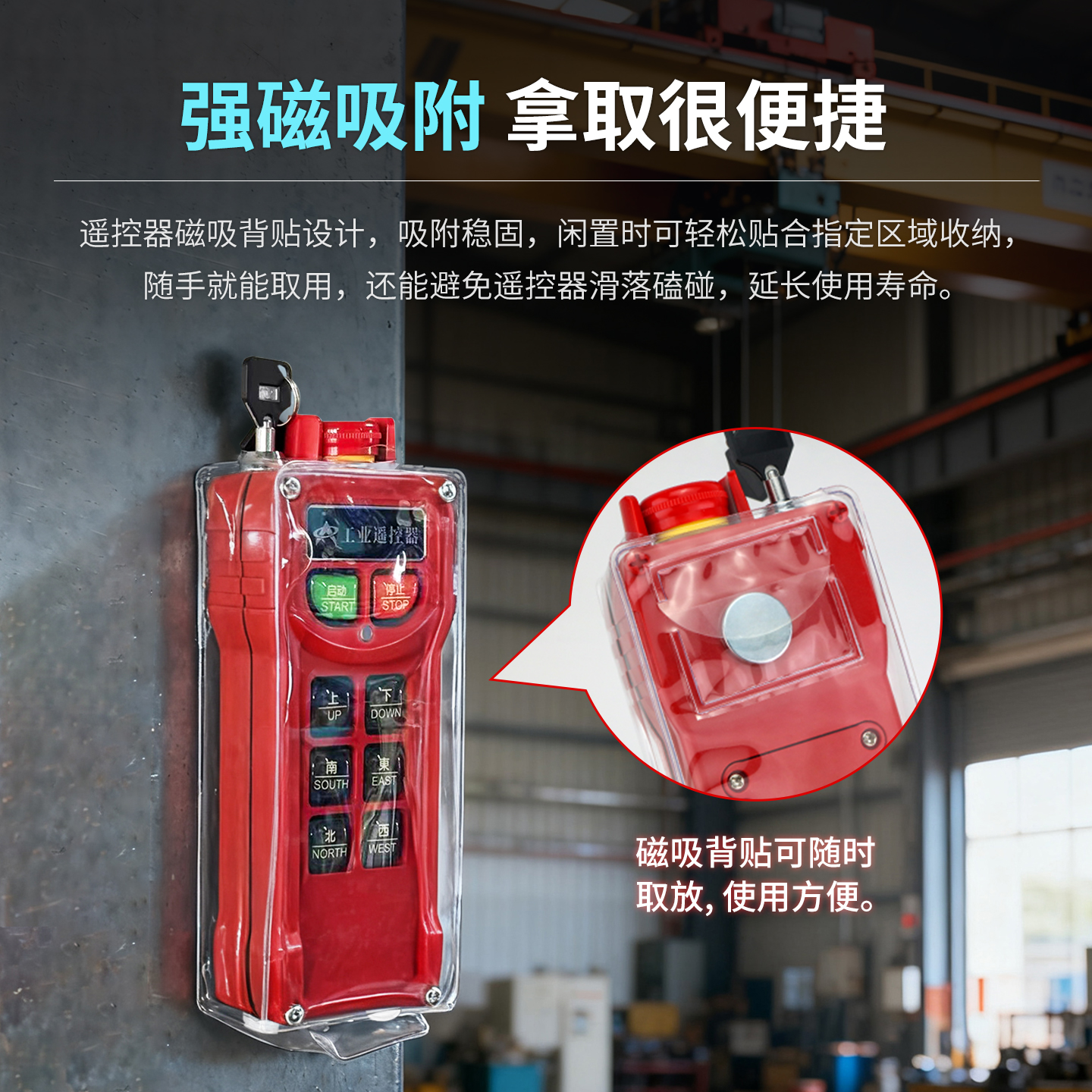 带有保护套和磁吸背贴的行车起重设备遥控器,解决了工业设备遥控器使用易脏污堵塞按键缝隙的问题,防水防摔防尘效果好!