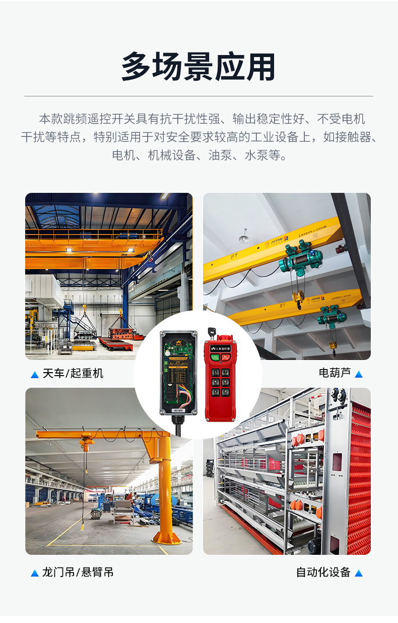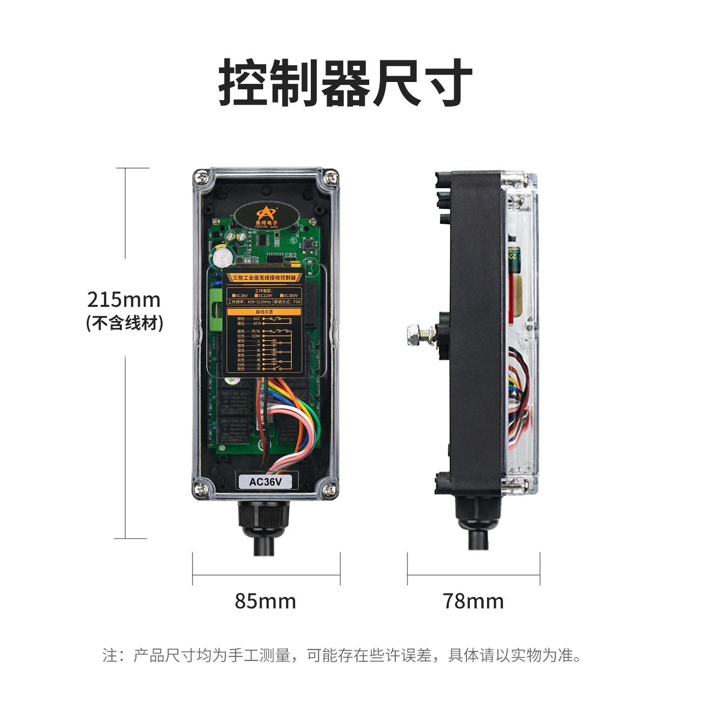 行车起重设备遥控开关(AK-C211112)拥有数据传输超高稳定性和超高灵敏度,数据传输 速率高,不受电机干扰等特点,程序采用滚动码加密处理,保密性强。控制器工作时每路独 立输出,互不干扰,操作方便,逻辑清晰。适合运用在工业控制场景上。