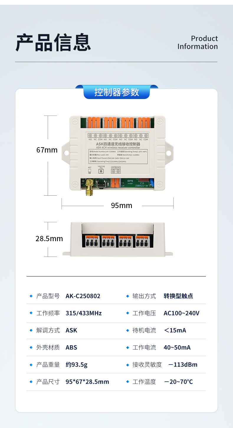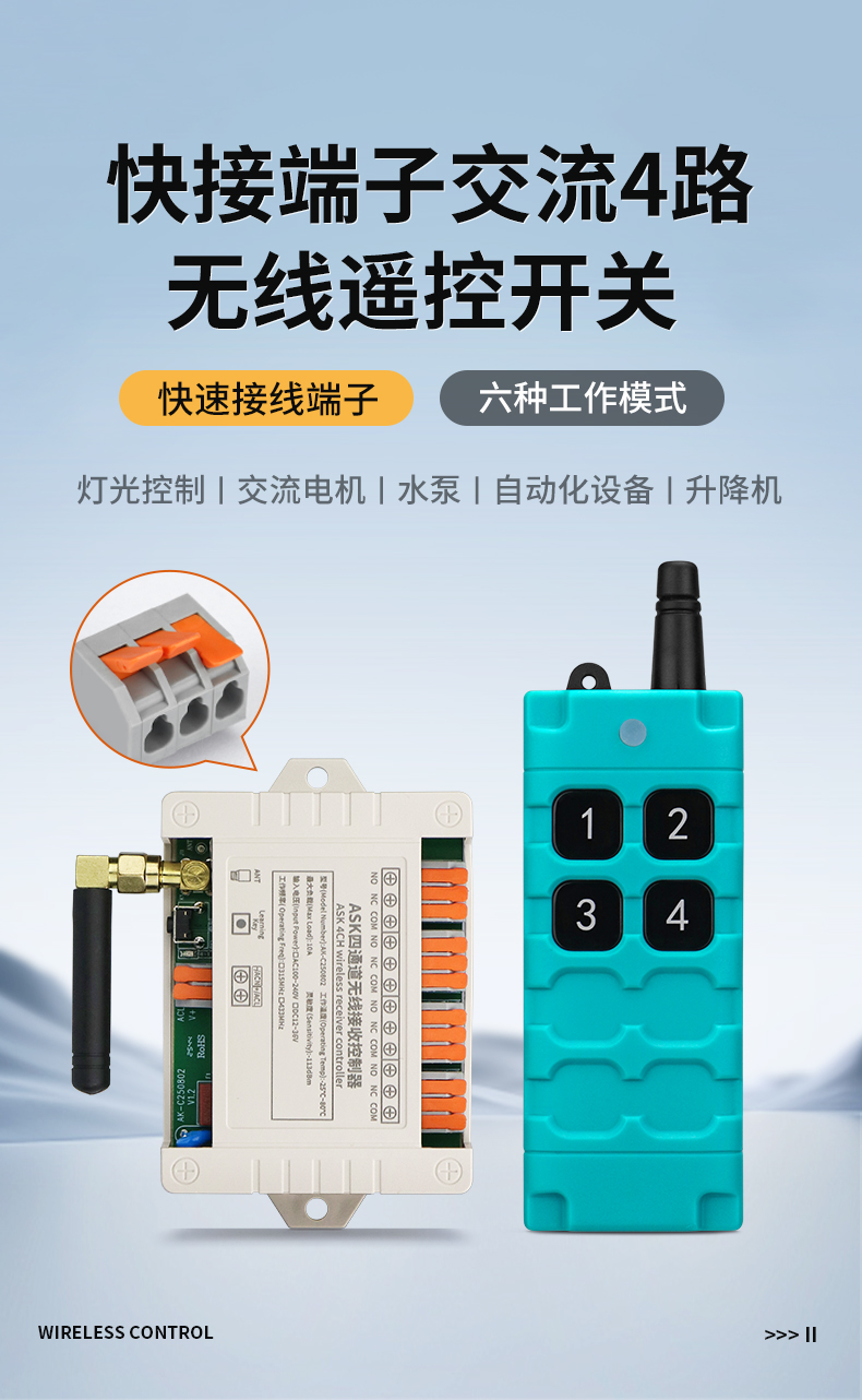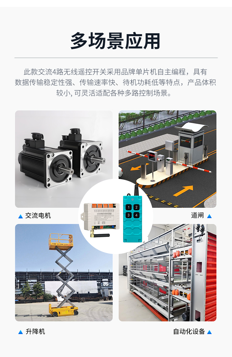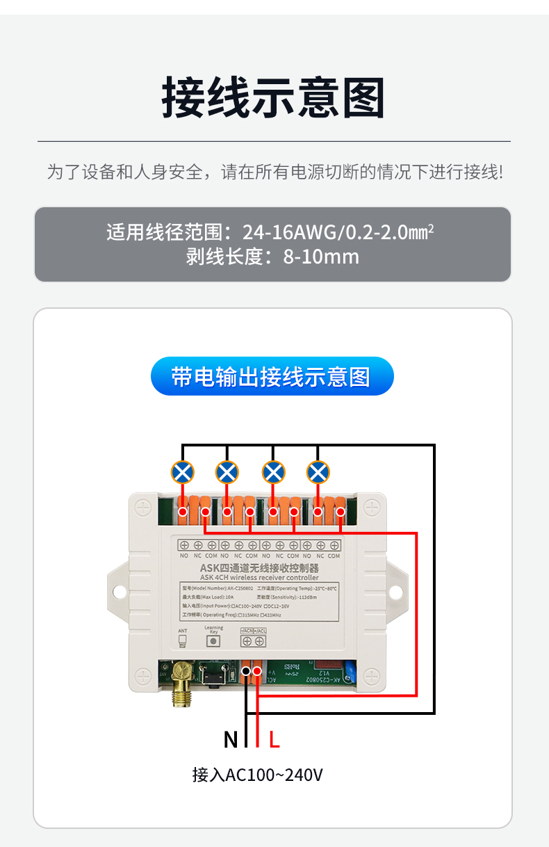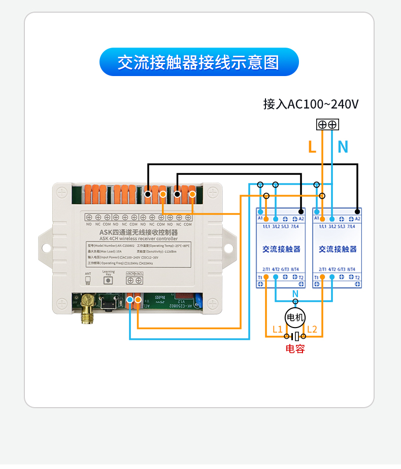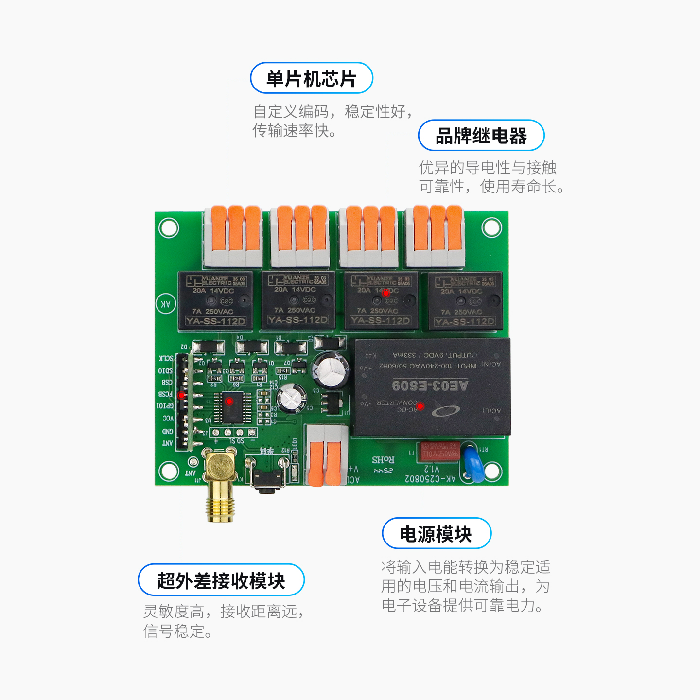 ASK快接线交流小工控四路控制开关 (AK-K250802)采用品牌单片机自主变成,具有数据传输稳定性强、传输速度快、待机功耗低等特点,如交流电机、道闸、升降机、自动化设备等。